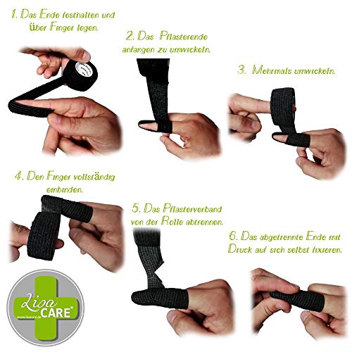 Vuil- en waterafstotend: de koolstof van LisaCare is water-, stof- en vuilafstotend, evenals vet- en olieafstotend, luchtdoorlatend en hecht alleen op zichzelf. – Zonder lijm, pijnloos verwijderbaar en zonder resten. Bovendien is de vingerpleister slip- en gripvast
